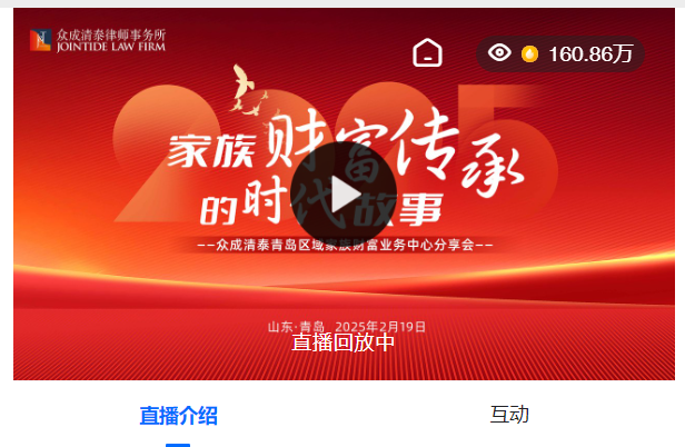 2月19日,“家族财富传承的时代故事”——众成清泰青岛区域家族财富业务分享会在青岛成功举行。活动采用线上线下结合形式,吸引了近百名企业家、法律从业者及高净值人士线下参与,160余万网友线上观看。