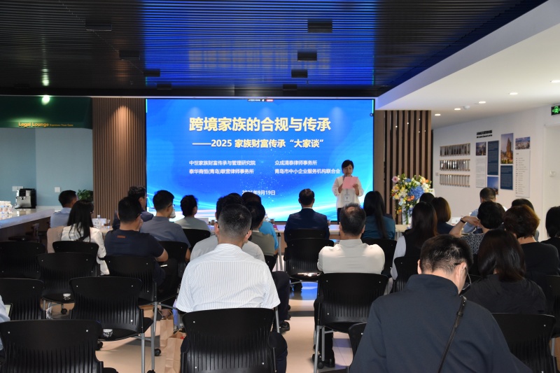 2025 年 9 月 19 日,由中世家族财富传承与管理研究院、众成清泰律师事务所、泰华商恒(青岛)联营律师事务所及青岛市中小企业服务机构联合会联合主办的《跨境家族的合规与传承——2025 家族财富传承“大家谈”》活动,在青岛国际商事法律服务会客厅举行。活动汇聚跨境金融、法律、企业咨询等领域专家,围绕 CRS合规、离岸工具应用、身份规划、跨境继承、企业出海等核心议题展开深度研讨,为高净值家族及中小企业全球化布局提供专业指引。